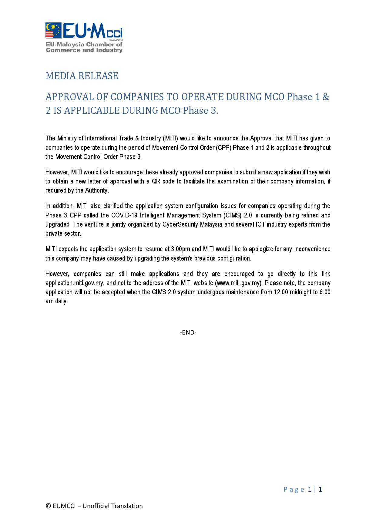 Twitter 上的 Eurocham Malaysia The Ministry Of International Trade Amp Industry Miti Had Announced That The Approval Given To Companies To Operate During The Period Of Movement Control Order Mco Phase 1 And
